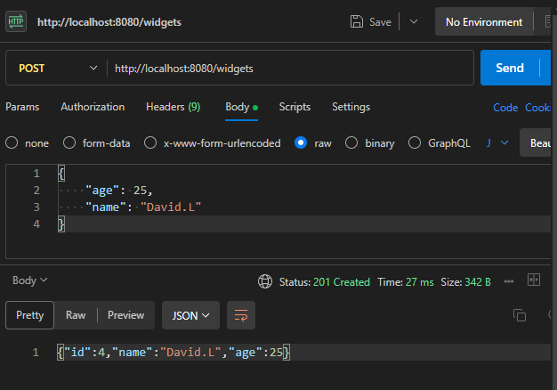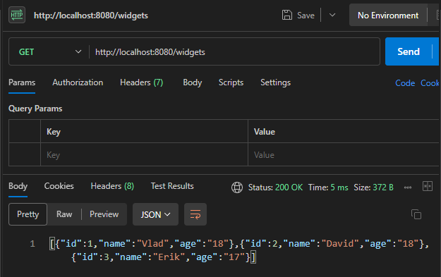 nüüd on meil aken, me kirjutame sinna: http://localhost:8080/widgets, seejärel vajutage nuppu “Send” mille järel saame koodis kirjutatud andmed