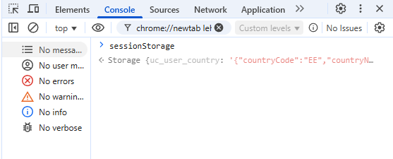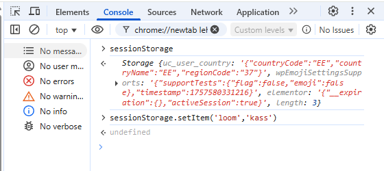 3.vali “Console” ja kirjuta käsk: sessionStorage ning vajuta ENTER