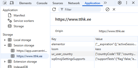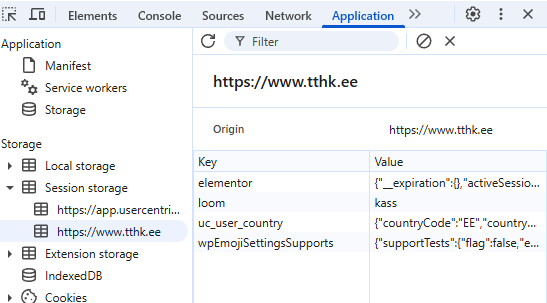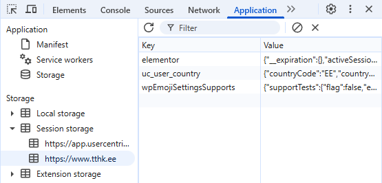 6.Kontrollimiseks peate minema jaotisse Application> Session Storage. Saate vaadata meie sisestatud teavet.
