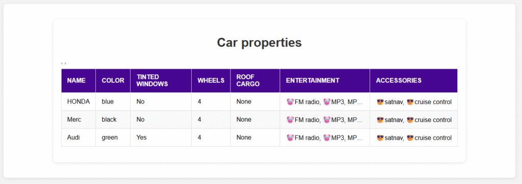 <td>${car.Accessories.map((e) => "😎" + e).join(", ")}</td>