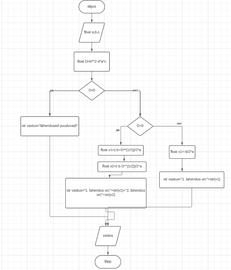 D>0, 2 lahendust -> x1=(-b+D**(1/2))/2a, x2=(-b-D**(1/2))/2a