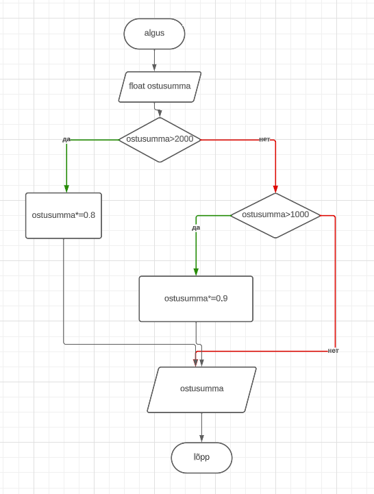 Koostage programmi skeemi ostu maksumuse arvutamiseks, võttes arvesse allahindlust. Kui ostusumma on üle 1000 euro, antakse 10% allahindlust, kui summa on üle 2000 euro, siis 20%.