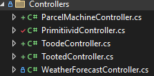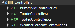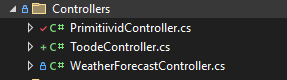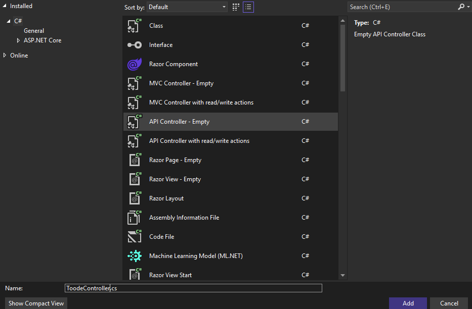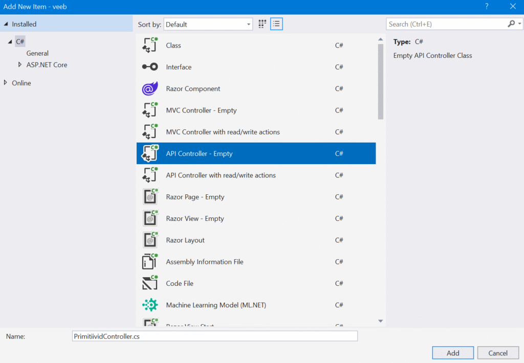 Uue faili loomiseks vajuta kausta “Controllers” kausta peal parema klõpsuga, vali “add” ning võta “New Item…”. Pane loodud faili nimeks ToodeController.cs ning vali tühja API kontrolleri mall (API Controller – Empty).