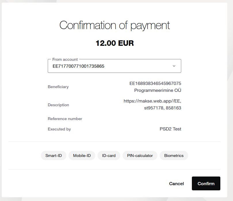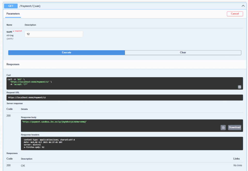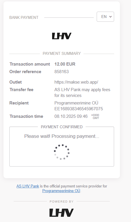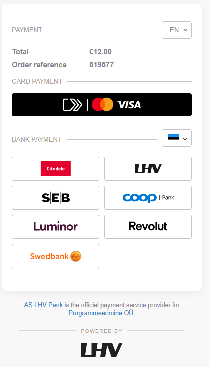 Saame näiteks sellis URL: https://payment.sandbox.lhv.ee/lp/q2zaxyd8q6/nXjxSePYOG