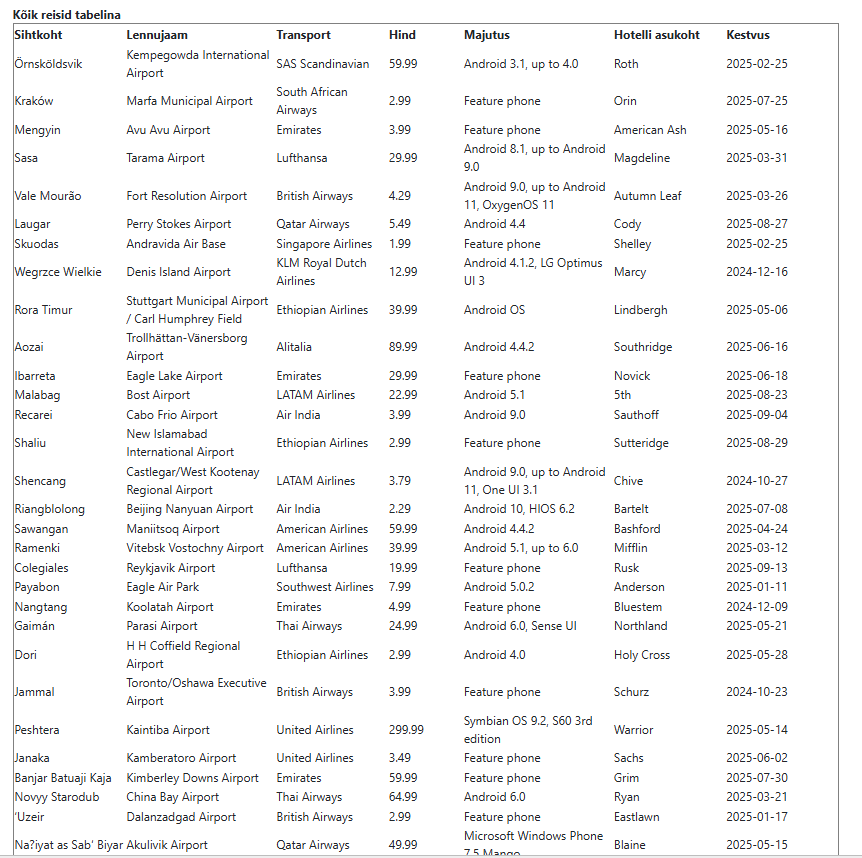 insert into Reis (Sihtkoht, Lennujaam, Transport, Hind, Majutus, Hotelli_asukoht, Kestvus) values ('Örnsköldsvik', 'Kempegowda International Airport', 'SAS Scandinavian', 59.99, 'Android 3.1, up to 4.0', 'Roth', '2/25/2025');